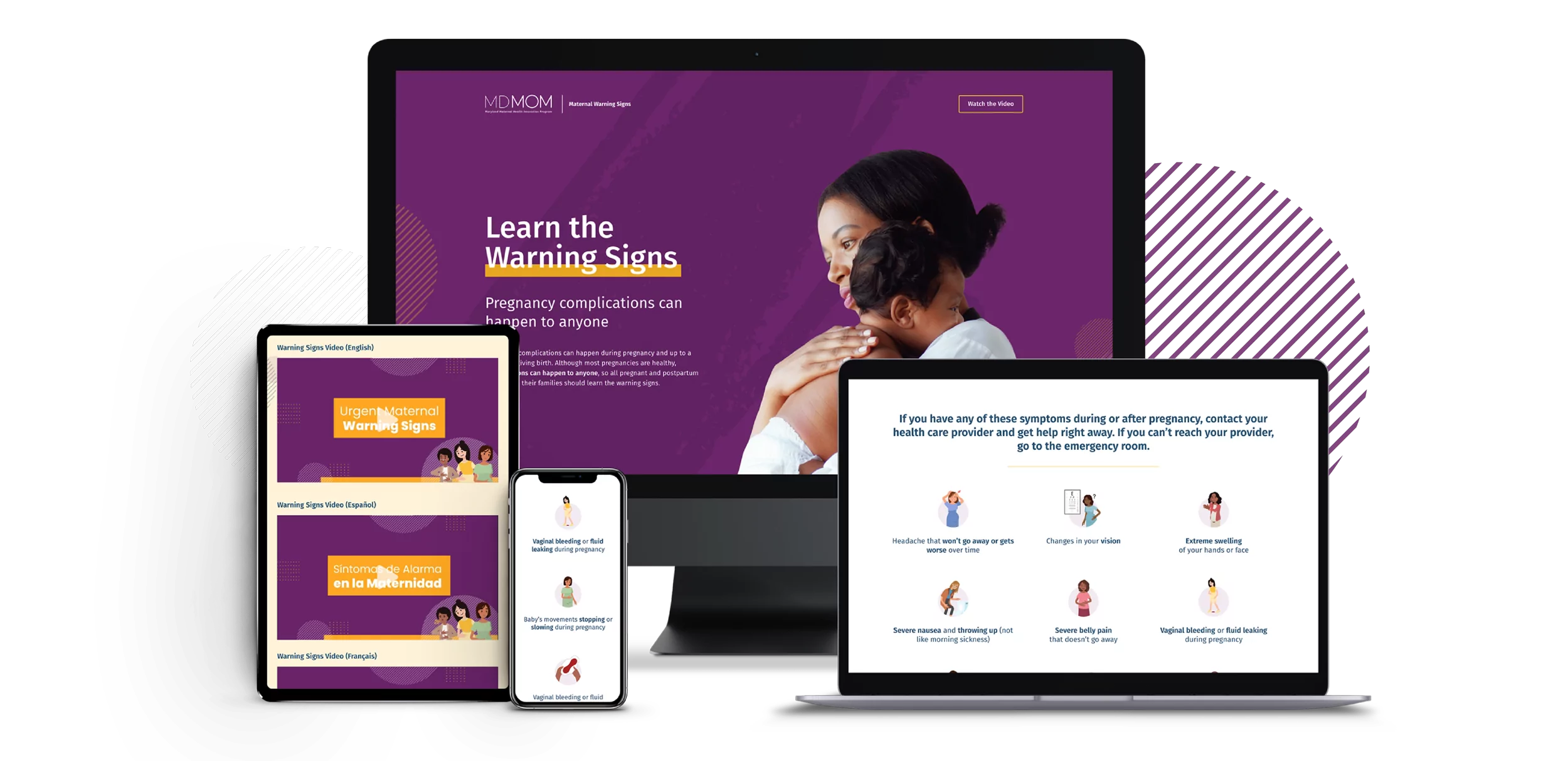 In support of the urgent maternal warning signs campaign, Hatcher also designed and developed a campaign landing page for MDMOM to reinforce its “pregnancy complications can happen to anyone” message and support its efforts in improving maternal health outcomes. The landing page offers helpful guidance in identifying key warning signs with infographic content and links to the Warning Signs video in three languages.